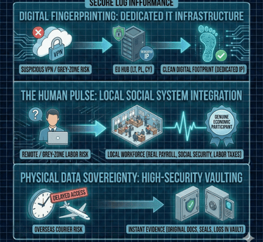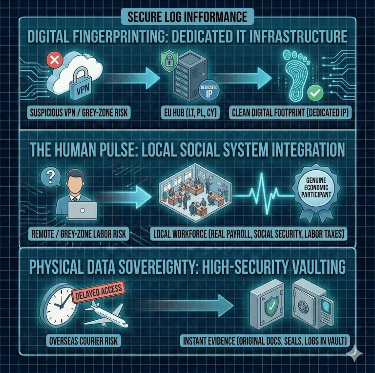 Digital Fingerprinting: We deploy a dedicated IT infrastructure for every client. Your banking transactions and corporate communications are tied to physical servers and dedicated IP addresses within your hubs in Lithuania, Poland, or Cyprus. We eliminate the risks of suspicious VPNs or remote access from 'grey-zone' locations that trigger compliance red flags.