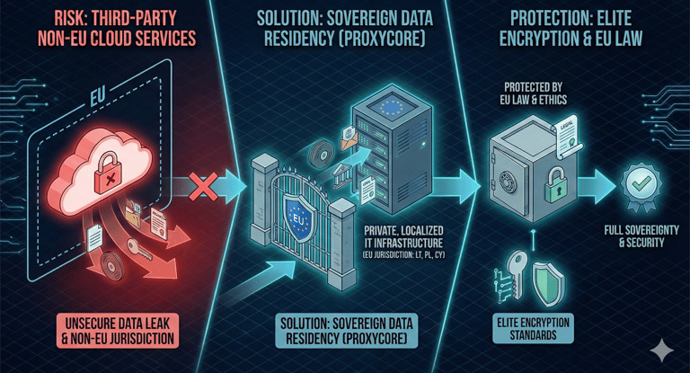 Legitimacy requires security. Every ProxyCore Hub is equipped with private, localized IT infrastructure. We do not use third-party non-EU cloud services for sensitive data. Your corporate records, banking keys, and legal documents are stored on sovereign servers physically located within your chosen EU jurisdiction. This ensures that your data is protected not only by our ethics but by the physical laws of European data residency and elite encryption standards.