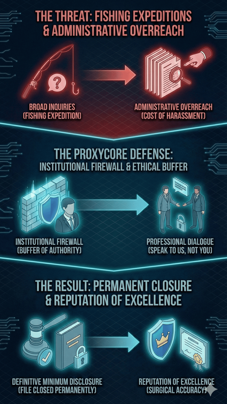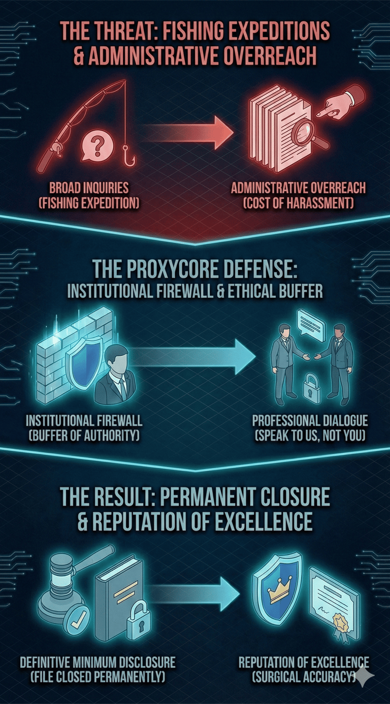Law enforcement and tax authorities often operate on the principle of 'investigative curiosity'—launching broad inquiries, or 'fishing expeditions,' in hopes of finding a technicality. ProxyCore acts as your Institutional Firewall. However, this defense is built on a singular, non-negotiable premise: The inherent legality of your enterprise.